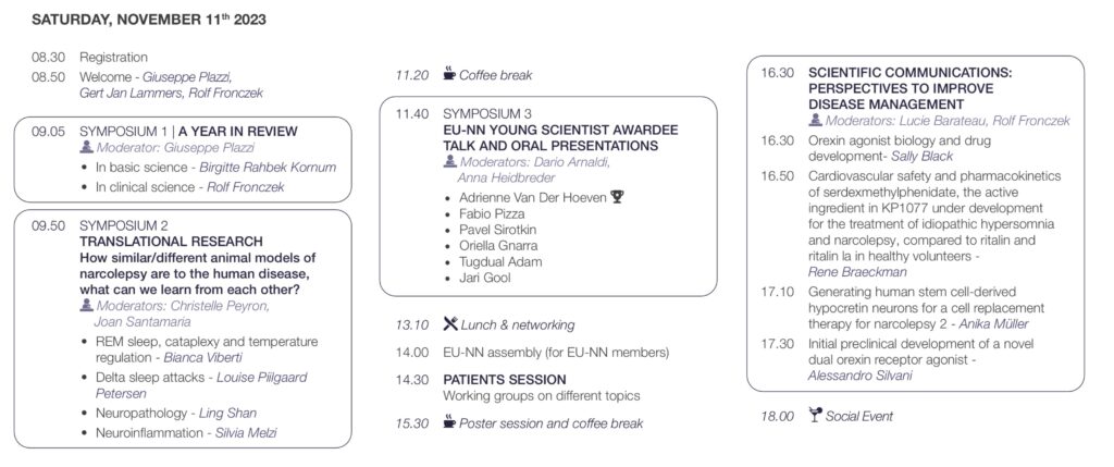 Sobotnie wykłady prowadzone były w sposób dynamiczny, ich tematyka obejmowała szeroki zakres związany z obecnymi osiągnięciami naukowymi w dziedzinie narkolepsji. Szczegółowy program zamieszczony poniżej: